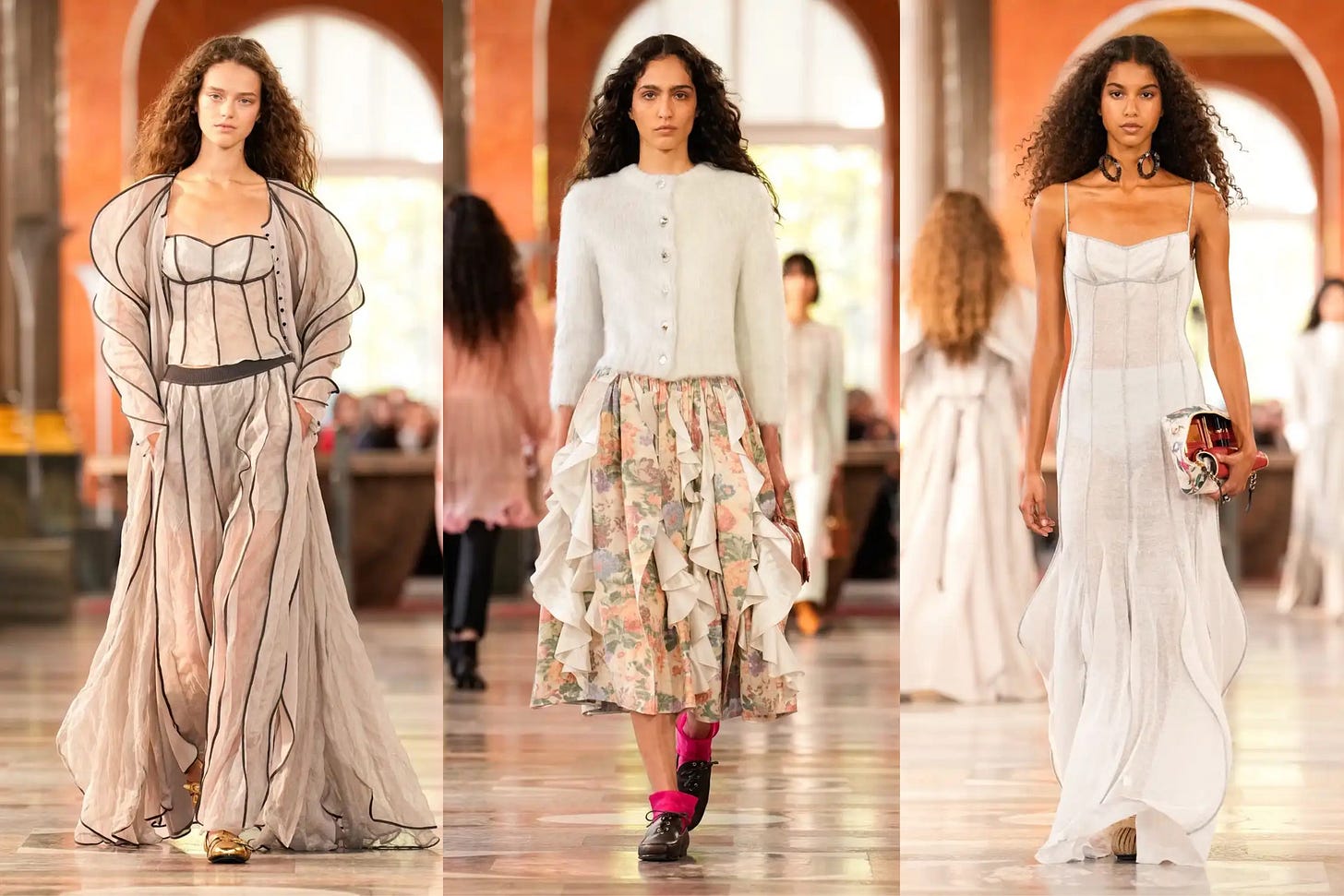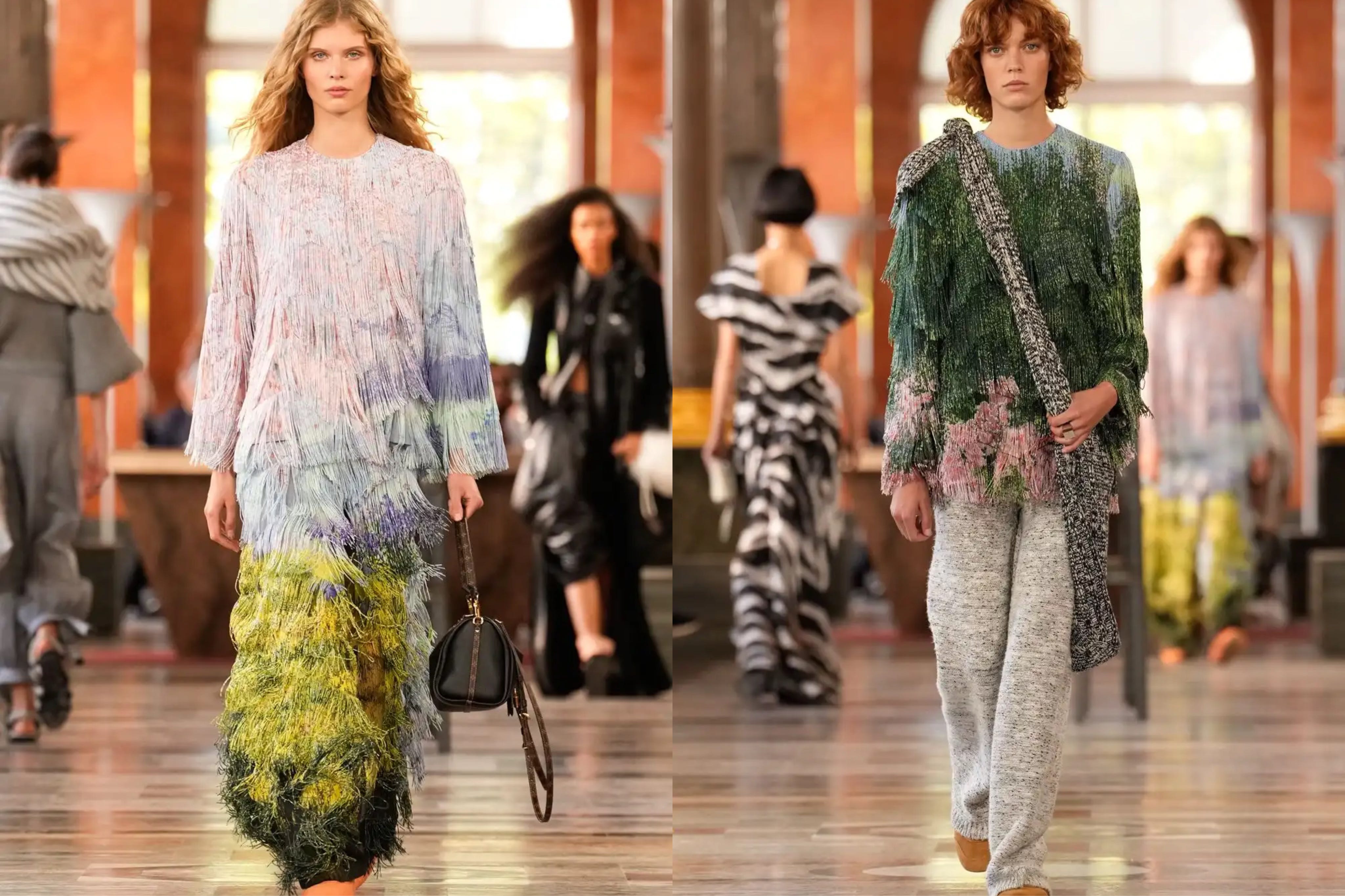We already saw fringe appear in FW25 but SS26 turns it into a full revival. Think fringed coats bags dresses and everything in between. The mood is very Kate Moss boho with a bit of Paris cool.